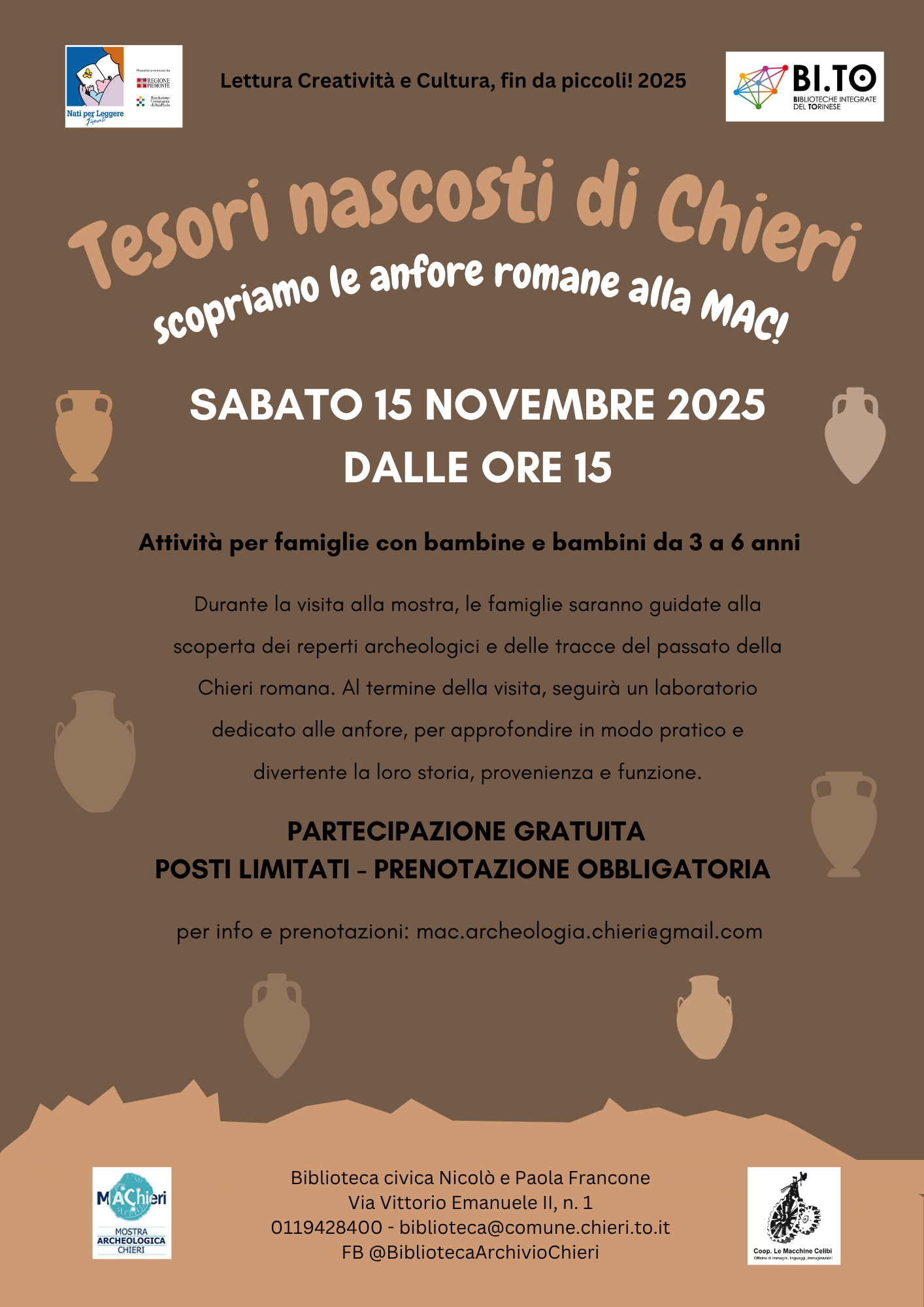 Durante la visita alla mostra, le famiglie saranno guidate alla scoperta dei reperti archeologici e delle tracce del passato della Chieri romana. Al termine della visita, seguirà un laboratorio dedicato alle anfore, per approfondire in modo pratico e