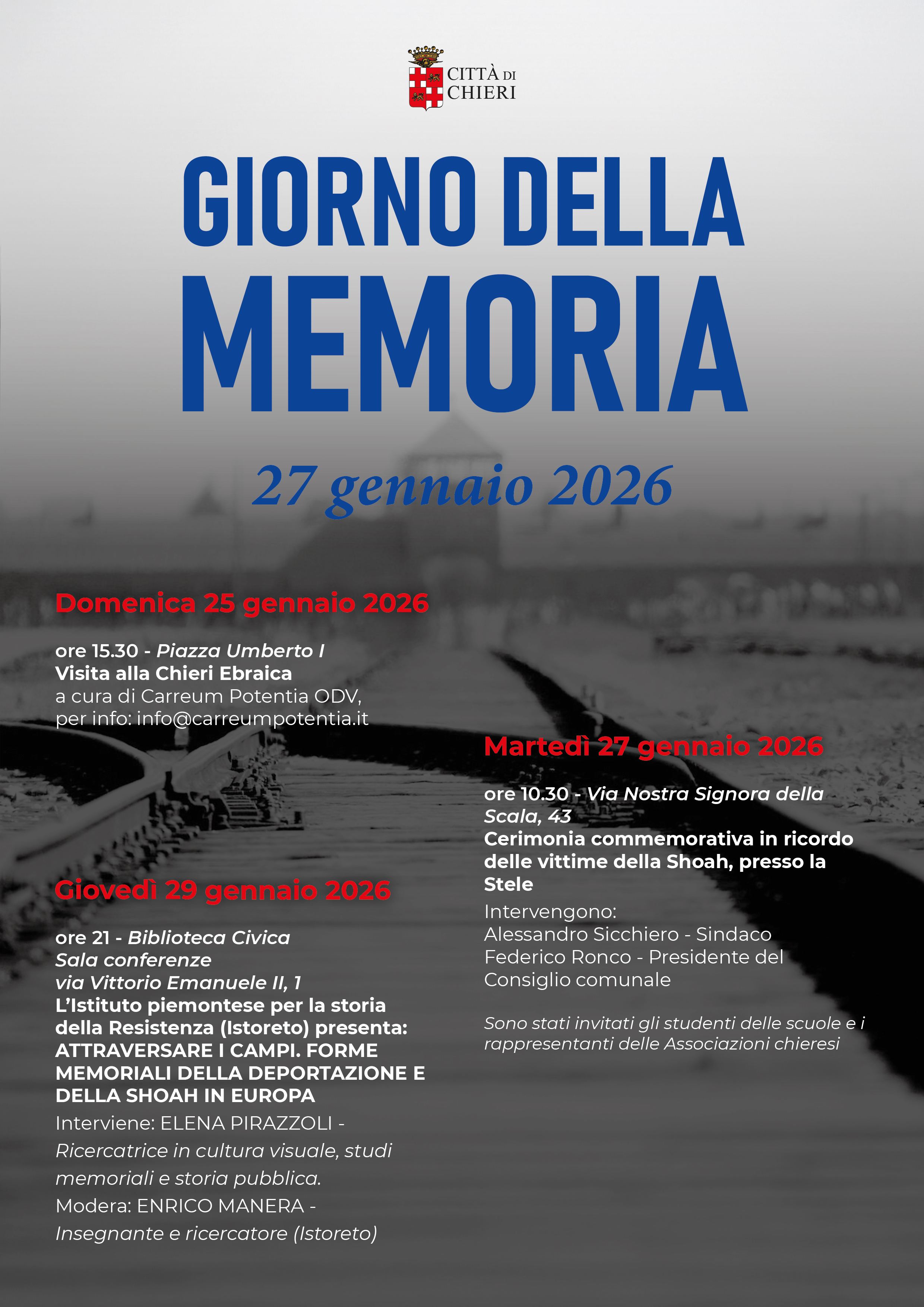 La Città di Chieri organizza il tradizionale cartellone di iniziative in occasione del Giorno della Memoria, ricorrenza istituita a livello internazionale per commemorare ogni 27 gennaio le vittime dell'Olocausto nell’anniversario della liberazione del campo di concentramento di Auschwitz.