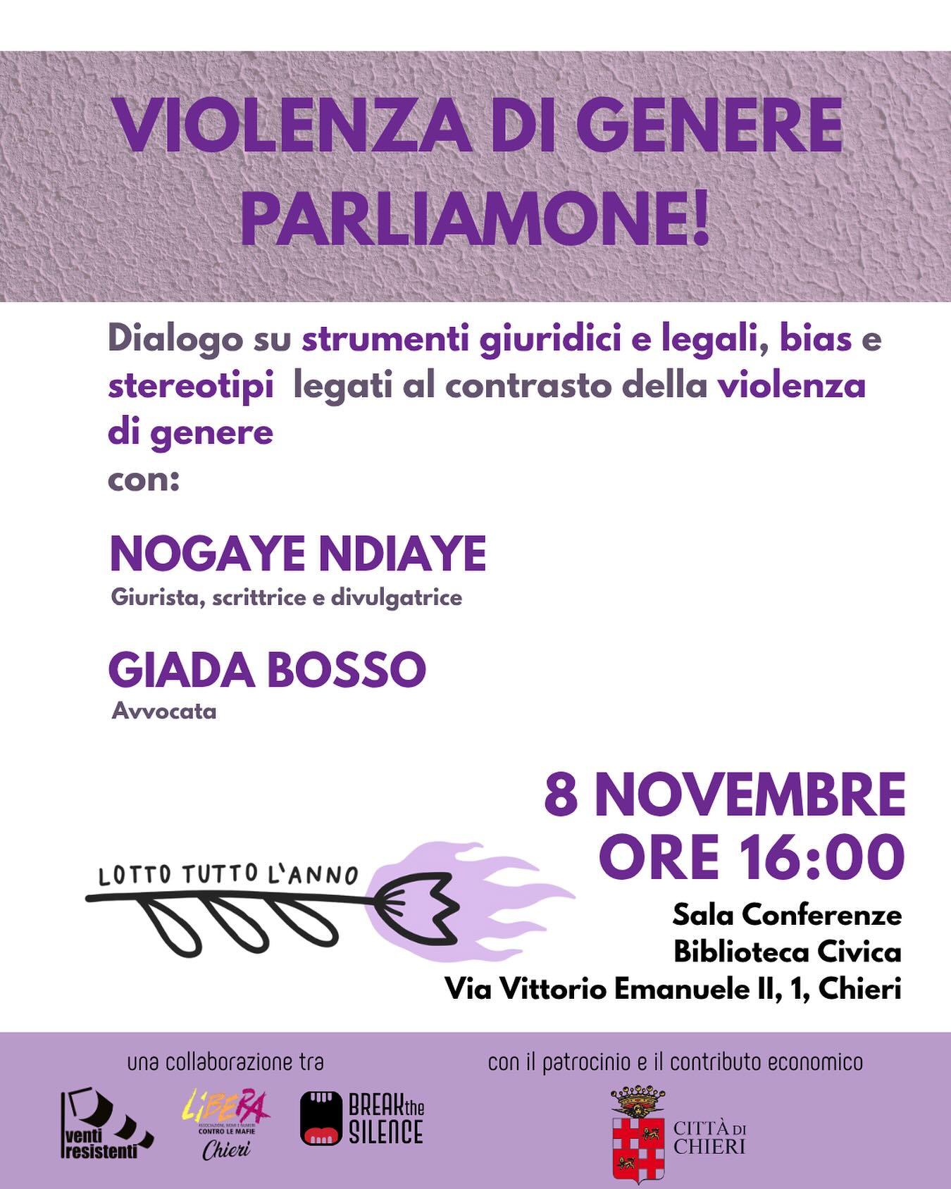 Dialogo su strumenti giuridici e legali, bias e stereotipi legati al contrasto della violenza di genere. Con: Nogaye Ndiaye (giurista, divulgatrice e scrittrice),Giada Bosso (avvocata). Organizzato da: Venti Resistenti, Break the Silence, Presidio Libera di Chieri
