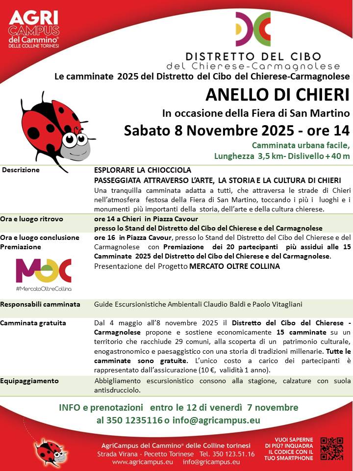 L’iniziativa si svolge nell’atmosfera festosa della Fiera di San Martino ed è parte del calendario “Le camminate 2025 del Distretto del Cibo del Chierese e del Carmagnolese”, promosse da AgriCampus del Cammino delle Colline Torinesi.