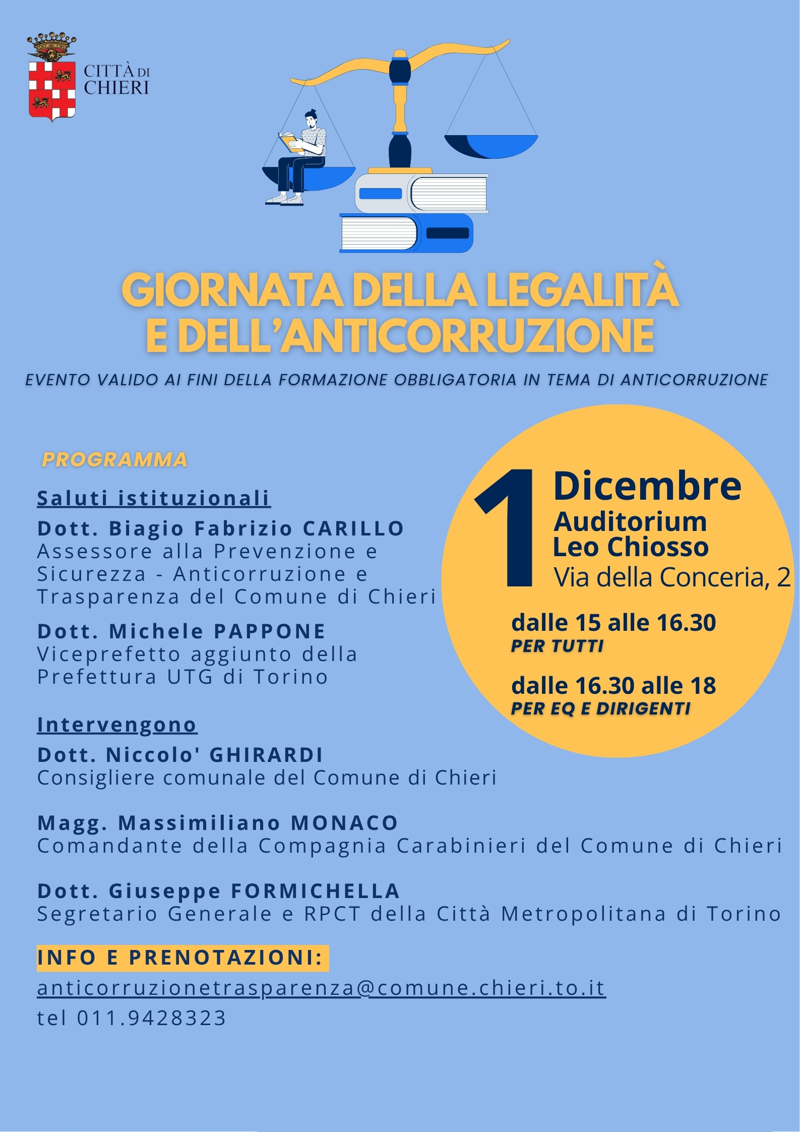 Il Comune di Chieri organizza un incontro dedicato ai temi della legalità, della prevenzione e della trasparenza amministrativa.